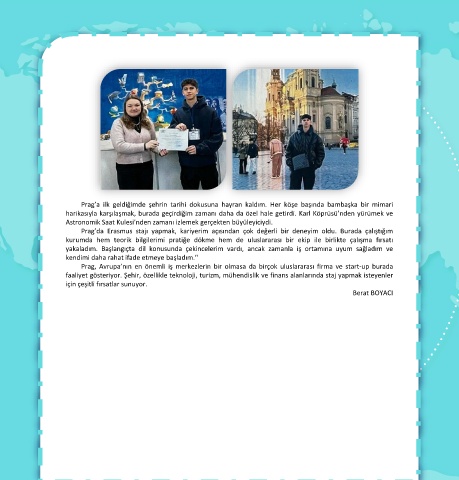 Prag’da Erasmus stajı yapmak, kariyerim açısından çok değerli bir deneyim oldu. Burada çalıştığım