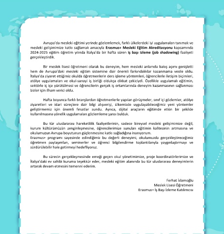 2024-2025 eğitim öğretim yılında İtalya’da bir hafta süren iş başı izleme (job shadowing) faaliyeti